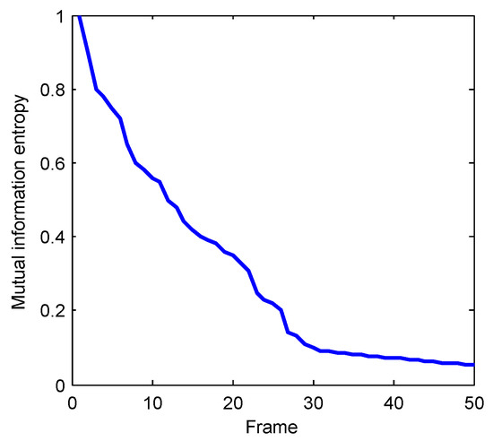 In our vehicle detection algorithm, feature map fusion plays a vital role, and the fusion weight ω in Equation (2) is the key factor. In the determination of the fusion weight ω , the first frame is chosen as the current frame, and then mutual information entropy is utilized to compute mutual information entropy. Figure 4 presents the mutual information entropy between the current frame and other frames.
