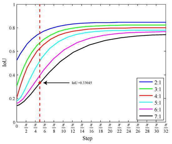 As illustrated in Figure 5, I o U is still larger than 0.3 in a step even when the length–width ratio is 7:1. Therefore, the chosen step is π / 5 , and the angle set is { 0 , π / 5 , 2 π / 5 , 3 π / 5 , 4 π / 5 } .
