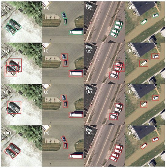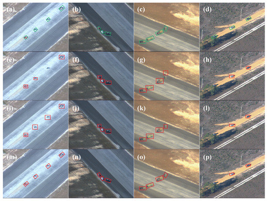 Figure 7. Comparison of the detection results for the OIRDS data set. (ad): The ground truth, (eh): Fast-CNN module, (il): YOLOv3 module, (mp): Improved YOLOv3 framework.