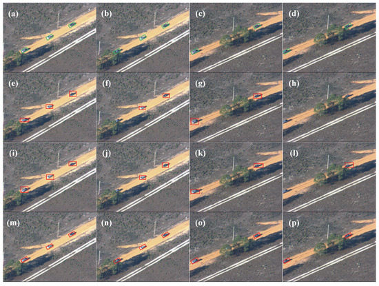 Figure 8. Comparison of partial occluded vehicles detection for the VIVID data set. (ad): Ground truth, (eh): Fast-CNN module, (il): YOLOv3 module, (mp): Improved YOLOv3 framework.