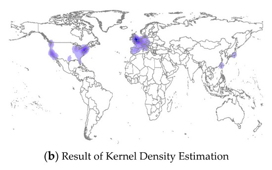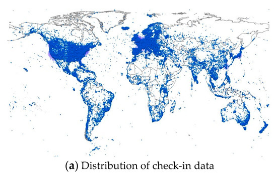 Flickr has released a publicly available dataset of 49 million geotagged photos [22]. We extracted the metadata of partial records created by users worldwide from Flickr. This dataset contained 1,605,291 records, which were distributed worldwide as shown in Figure 1a. Meanwhile, we exploited KDE to analyze the popularity of Flickr check-in records, as shown in Figure 1b. There was apparently high popularity in several regions, such as North America and Europe, which are typically developed regions. It is not difficult to see that the popularity of check-ins in the northern hemisphere is substantially higher than that in the southern hemisphere.