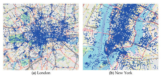Distributions of check-in data in two cities. Subfigure (a) and (b) are the spatial distributions of check-in data in London and New York, respectively.