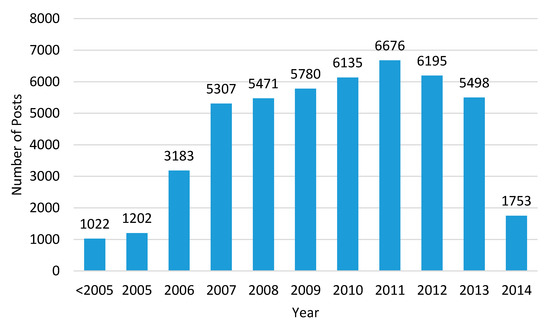It is common to preprocess raw data before further analysis, which can ensure the completeness and accuracy of the data. There were some deviations within the Flickr raw dataset. We can exploit the temporal pattern to eliminate obviously wrong data from the raw dataset. For example, the Create_date of some records were obviously wrong (e.g., dates in the 1980s even though Flickr was founded in 2004). As shown in Figure 3, except for these with date errors, most of the records were created from 2005 to 2014. Since the objective of this paper is to infer categories of POIs through spatiotemporal patterns and text information in check-in data, data that were not georeferenced or had errors in any field were filtered out. We selected records according to 2 constraints: (1) the length of the comment text to be greater than 30 words, and (2) the Create_date of check-in between 2005 and 2014.