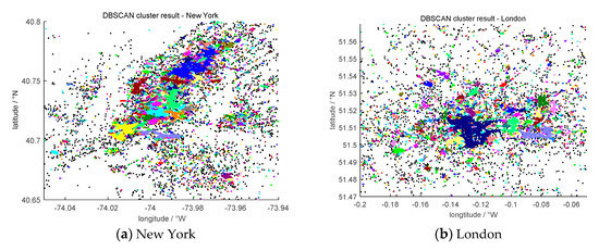The clustering results are shown in Figure 4. Except for black, which indicates noise, the various colors indicate different clusters, respectively. As we can see, in the study region of New York, the clusters with a high density and large area were concentrated on Manhattan Island, while small-sized and medium-sized clusters were mainly located on the marginal areas of the island and the other side of the rivers. However, in the London study region, there were two gathering centers, which were close to St. James’s and the Covent Garden.