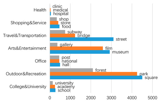 As shown in Figure 5, we counted the frequencies of keywords in each category and found that there were large differences in the word frequencies of different categories. We assumed that a word mentioned more than 3000 times can be considered a high-frequency word. For example, the “Outdoors & Recreation” category had multiple high-frequency keywords (e.g., “park” and “square” were mentioned more than 4000 times), while “Travel & Transportation” only had one high-frequency keyword (“street”). The word frequencies of the remaining categories were relatively low. In particular, keywords of “Health”, “Shopping & Services”, “office”, and “College & University” did not appear more than 1000 times.