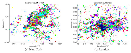 With the aim of expressing the proportion of each POI annotation more intuitively, we analyzed the clustering results. The distribution of POIs among the categories is depicted in Table 5. It can be seen that the proportion of the POI categories was generally similar in New York and London, with slight differences reflected in two categories. In New York, there were 10% more POIs of “Outdoors & Recreation” and 4% less “Office” than that in London. From the inside of a city, taking New York as an example, most users tended to check-in at outdoor leisure venues, public office areas, and arts and entertainment areas, with each accounting for 36.04%, 22.07%, and 12.76% of the POIs, respectively. This result shows that users were more willing to share their locations at the workplace or in leisure areas. In contrast, medical and health areas had the lowest check-in frequency (0.84%). The experimental results are consistent with the fact that people generally do not want to share their poor physical condition with the public.