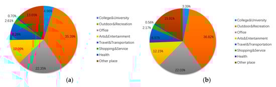 Proportion of each location category in POI annotation. for (a) weekdays and (b) weekend days.