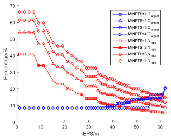 The resulting changes in the Nratio and Clargest are shown in Figure 8 based on different values of MINPTS and EPS. As shown in Figure 8, when the EPS was less than 40, the Nratio decreased rapidly, while Clargest remained smooth, when the EPS was more than 40, the Nratio changed slowly, and when the EPS was more than 48, Clargest increased significantly. Regarding MINPTS, the Nratio was sensitive to MINPTS, which was the lowest when MINPTS was equal to 1, while Clargest was hardly affected by MINPTS. In general, we aim to minimize the sum of the Nratio and Clargest. Thus, we set EPS = 48 m and MINPTS = 1. Under these conditions, the Nratio of the dataset was 12.76% and Clargest was 12.26%.