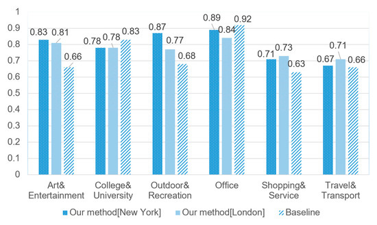 In addition, to illustrate the universality of the proposed method, we compared the F-values in two cities (London and New York). As evidenced by the values (Y-axis) in Figure 9, overall the F-values of the annotation results are similar in London to that in New York. The most significant difference existed in the class “Outdoors & Recreation”, where the F-value in London was lower than that in New York. This may be due to less sampled POIs of “Outdoors & Recreation” in the study region of London. The results of this experiment demonstrate that our method is able to achieve similar performance in different regions.