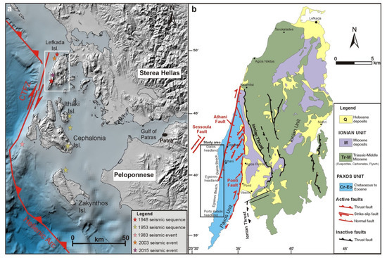- Papadopoulos, G.A.; Karastathis, V.K.; Koukouvelas, I.; Sachpazi, M.; Baskoutas, I.; Chouliaras, G.; Agalos, A.; Daskalaki, E.; Minadakis, G.; Moshou, A.; et al. The Cephalonia, Ionian Sea (Greece), sequence of strong earthquakes of January–February 2014: A first report. Res. Geophys. 2014, 4, 5441. [Google Scholar] [CrossRef][Green Version]
