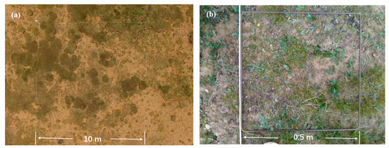 In the summer of 2016 we laid a sample plot of 10 m × 10 m (consistent with the highest spatial resolution of Sentinel 2 images) for each of the five grassland types (swamp meadow, alpine meadow, degraded meadow, steppe meadow and alpine steppe) in the study area, and the boundary of each sample plot was fixed with white cloth strips (Figure 2a). The five selected grassland types covered all grassland types in the study area, and are also the main grassland types in the Qinghai-Tibet Plateau. In each sample plot, a quadrocopter (DJI Phantom 3 Professional, DJI Inc. Shenzhen, China) with an integrated camera (12 megapixels) was used to shoot from above the sample plot at a height of 20 m, and the aerial image of each sample plot was acquired for analyzing the underlying surface heterogeneity of the sample plot. In order to analyze the impact of the number of quadrats on the survey results, we divided each sample plot evenly into 400 0.5 m × 0.5 m quadrats (Figure 3). To facilitate data collection, we customized a 0.5 m × 0.5 m iron frame to determine the extent of each quadrat. In each quadrat, we used the digital camera to photograph an image from above (~1 m), in order to obtain the image of the quadrat (Figure 2b), which was used for fractional vegetation cover (FVC) information extraction. The camera mounted on the quadrocopter and used for ground photography is a three-band digital camera which receives irradiance in the visible region (red, green and blue spectral bands) and stores it as a gray value from 0 to 255 in JPEG format.
