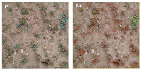 Effect diagram (a) original image; (b) processing result of image (Red curves and yellow curves indicate vegetation contour, non-vegetation contour respectively).