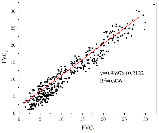 Comparison of the FVCs of the quadrat extracted by the different person (FVC1 and FVC2 represent the FVC data obtained by different people, respectively).