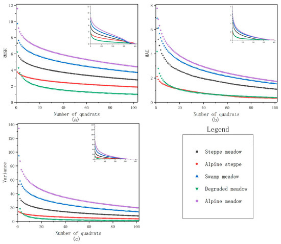 For the five grassland types in the study area, there was a logarithmic relationship between the number of quadrats and the survey error. With the increase of the number of quadrats, the error of the survey results was smaller, and the obtained FVC was closer to the true value of the remote sensing pixel scale. Additionally, different grassland types had specific differences in the relationship between the number of quadrats and the error of survey results of FVC. When the number of quadrats was the same, the largest error of the survey results was observed in the alpine meadow, followed by the swamp meadow, steppe meadow, alpine steppe and degraded meadow. When the error of the survey results was held constant, the degraded meadow required the least amount of quadrats, while the alpine meadow required the most. From the relationship between the error of the survey results and the number of quadrats (Figure 7), it can be seen that with the increase of the number of quadrats, the most obvious error trend is the alpine meadow, and the error trend of the alpine steppe is the smallest.