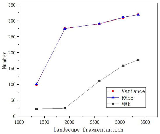 In this study, the relationship between the degree of fragmentation of the landscape pattern and the survey accuracy of FVC was analyzed by calculating the patch density of five grassland types in the study area. The patch density is the ratio of the number of patches to the area, and its size reflects the degree of fragmentation and spatial heterogeneity of the surface. In order to avoid the influence of the underlying surface heterogeneity, 1 was used as the error measurement value of the three precision indicators of RMSE, MAE and variance, and the number of quadrats required for the five plots in the study area was investigated. The study found that the patch density of the alpine steppe was the smallest, indicating that the alpine steppe was dominated by large patches and the degree of fragmentation was low (Table 1); the patch density of the alpine meadow was the largest, indicating that the patches of the alpine meadow were mainly composed of small patches and the degree of fragmentation was the highest. With the increase of the degree of fragmentation of the plot, the number of ground survey quadrats required to obtain high-precision FVC also increased (Figure 8). The results show that the degree of fragmentation of the underlying surface has a high correlation with the number of quadrats required for high-precision FVC.