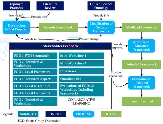 We first investigated several relevant resources on toponymic guidelines, citizen science, VGI, and crowdsourcing. We combined parts of a citizen science ontology developed by a COST Action (https://cs-eu.net/wgs/wg5) [22] to modify the framework. Then, we improved the framework using existing knowledge and feedback from multiple stakeholders. Changes requested by stakeholders were made in an iterative process. When a new change request was made, the modification was approved or rejected after several discussions.