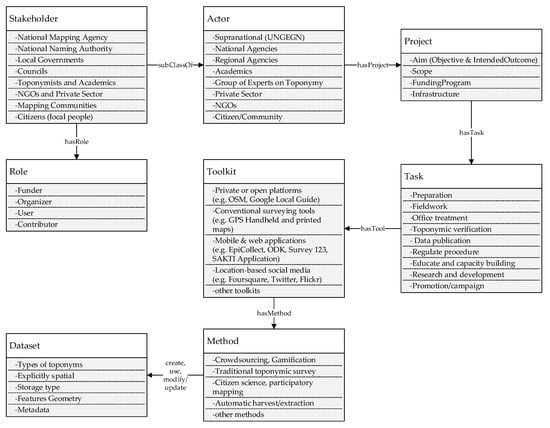 In the initial proposal, we focused on how toponym handling could help provide an enriched toponymic file and gazetteer. The initial generic framework on handling toponyms using a participatory approach was introduced and modified after several discussions. During these processes, stakeholders shared their knowledge and information on handling toponyms. In the modified framework (see Figure 3), we then changed the focus from data-oriented problems to toponym handling as a project-based approach. In the modified framework, we define eight classes: Stakeholder, Actor, Role, Project, Task, Toolkit, Method, and Dataset. The types of toponym handling in a proposed generic framework are covered in Method. Some categories in that framework were adopted from Citizen Science Ontology [22], for example, elements in Role class and Project class.