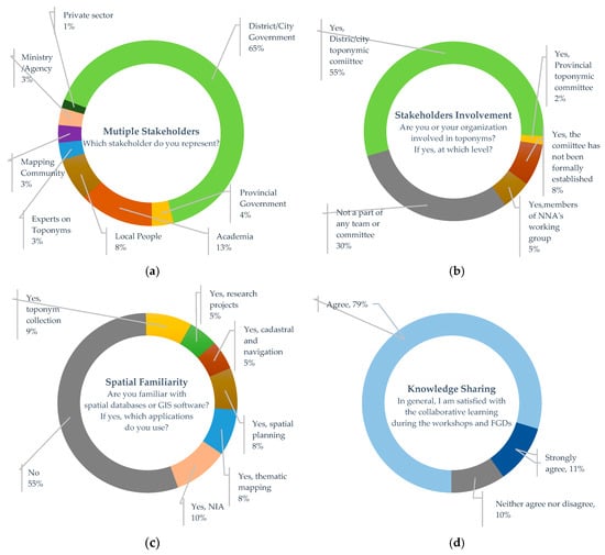 There were four lists of questions on stakeholders’ background, involvement, and willingness to share knowledge during PTH development and framework testing. Figure 4a shows the percentages of stakeholders interested in PTH and in participating. Some members of the public (8%) were willing to play an active role in participatory toponym handling projects. Figure 4b shows stakeholder participation in current toponyms practice. Most of the participants in the workshops and FGDs were from local committees at the district/city level and provincial level. However, thirty percent of respondents were not part of any toponym collection team or committee in Indonesia. Figure 4c indicates spatial familiarity. More than half of the participants in the workshops were not familiar with spatial data. This information allowed us to provide a better introduction to toponyms as part of geographic data collection using mobile and web applications.