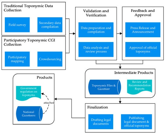 Since 1959, the United Nations Group of Experts on Geographical Names (UNGEGN) has promoted the preservation of toponyms and encouraged each country to collect and maintain toponyms [1,2]. UNGEGN provides an umbrella for each country to develop its regulations by developing a legal framework for toponym collection and maintenance. A national names authority (NNA) or a group of experts on toponymy (toponymists) have the responsibility to share their knowledge and existing technical and legal framework with the stakeholders. Stakeholders may include groups of experts on toponyms from academic and research institutions, the government, non-governmental organizations (NGOs), and members of the public (individual volunteers or local communities). Toponym collection has usually been conducted by a government agency, such as a national mapping agency (NMA) as part of its topographic mapping activity, or any other institution like an NNA or coordinating body on toponyms [3,4].