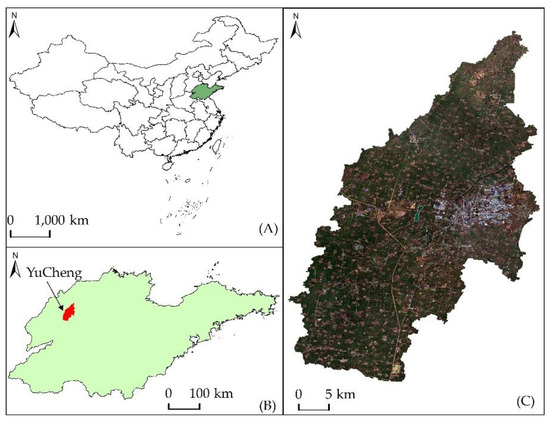 The location of Shandong Province in China (A); the location of the study area in Shandong Province (B); the study area is shown in one true color (R: red, G: green, B: blue) image using ZY-3 data of 2 December 2014 (C).