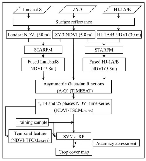 Figure 2 presents the flowchart of this study. First, all remote sensing data were clipped to the same region. The NDVI was calculated using red and near infrared (NIR) bands. Then, the time series of the Landsat 8 and HJ-1A/B NDVIs were fused with the ZY-3 NDVI using STARFM [29]. To reduce the effect of noise on the vegetation data, the fused NDVI time series was filtered by Time-series Satellite data Analysis Tool (TIMESAT). Finally, the NDVI time series and its corresponding temporal features were used to classify crops using the SVM and RF, respectively, and to evaluate the accuracy of the classification results.