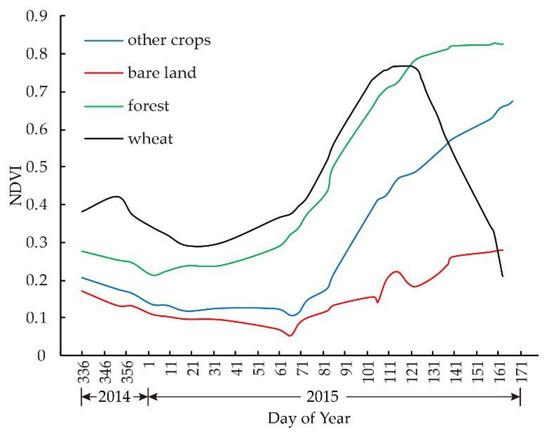 The NDVI time series can appropriately reflect the growth of vegetation and contains the information used to distinguish vegetation types [44,45], such as the seasonal and phenological changes. The NDVI time series can represent the seasonal and annual variations in crop growth (i.e., periodic variations from planting, seedling emergence, maturity at harvest) [36]. For winter wheat, there were two peaks in the NDVI curve during the growth period (Figure 3). The first is in early December. After the sowing period, the NDVI of winter wheat increased gradually and reached the first peak, while the NDVI of other vegetation decreased gradually with decreasing temperature. At this stage, the time-NDVI slope of wheat was greater than zero, while that of other vegetation was less than zero. The second occurred between late April and early May. The biomass of winter wheat increased rapidly after rising and jointing, and the NDVI also increased. By early May, the NDVI value reached its maximum, forming a second peak. Then, the leaves gradually withered, and the NDVI gradually decreased, and the curve slope of NDVI was less than zero. However, the curve slope of the NDVI of other vegetation was greater than zero, and the NDVI was still increasing. The change characteristics of the NDVI curve are an important basis for identifying winter wheat.