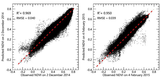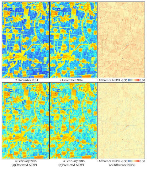 To validate STARFM, a small rectangular region of approximately 1390 × 865 pixels was randomly selected from the observed and predicted NDVI images from 2 December 2014 and 4 February 2015 (Figure 4 and Figure 5). The results illustrated that the NDVI spatial distribution was consistent between the observed and predicted NDVIs, and the difference values between Figure 4a,b were mainly distributed around zero (Figure 4c). According to the correlation analysis, the distribution of the scatter points was concentrated along the line of x=y. The R2 values were 0.969 and 0.950 at the 0.01 significance level, respectively (Figure 5); the RMSEs were 0.040 and 0.039, respectively, which meant that the estimation error of the predicted NDVI image was only approximately 4% (Figure 5). This result indicated that the deviation between the predicted and observed NDVIs was very small.