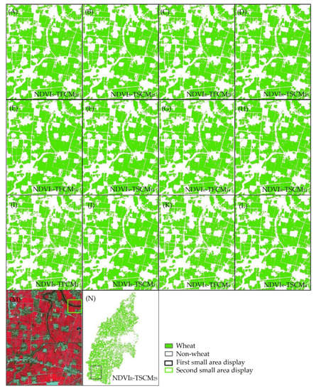 A smaller area can better show the detailed differences in the classification results, so the second smaller area is shown in Figure 7. Figure 7N displays a small area that was obtained from Google Earth on 8 February 2015, to discern the wheat region. The classification accuracy with NDVIS-TFCM14/25 was higher than that with NDVIS-TSCM14/25 over the small areas, roads, or other linear features (Figure 7A,B,E,F). The classification accuracy with NDVIS-TSCM4 on the patch features was higher than that with NDVIS-TFCM4, but the identification accuracy of the linear features was weaker than that with NDVIS-TFCM4 (Figure 7I,J). With the increase in the NDVI phases from 14 to 25, the misclassification probability for the roads was reduced, and the ability to distinguish between wheat and non-wheat was stronger (Figure 7A,E). The recognition accuracy with NDVIS-TFCM4 on wheat was significantly weaker than those using NDVIS-TFCM25 and NDVIS-TFCM14 (Figure 7A,E,I). With the increase in the NDVI phases, the recognition accuracy of using NDVIS-TSCM on non-wheat was also improved (Figure 7B,F,J). At the same time, for the SVM classifier, the increase in the NDVI phases from 4 to 14 and then to 25 was helpful for improving the accuracy of classification results, which was consistent with the conclusion from the ground survey.