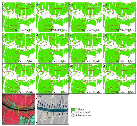 Comparison of crop classification accuracy between NDVI-TSCM and NDVI-TFCM over the second small region; the classification results of NDVIS-TFCM25 (A), NDVIS-TSCM25 (B), NDVIR-TFCM25 (C), NDVIR-TSCM25 (D), NDVIS-TFCM14 (E), NDVIS-TSCM14 (F), NDVIR-TFCM14 (G), NDVIR-TSCM14 (H), NDVIS-TFCM4 (I), NDVIS-TSCM4 (J), NDVIR-TFCM4 (K), and NDVIR-TSCM4 (L); a standard false color composite image using the ZY-3 data of 2 December 2014 (M); a small area that was obtained from Google Earth on 8 February 2015 (N).