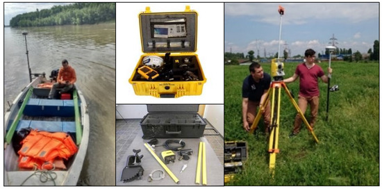 Left: Bathymetric depth measurements with SonarMite single-beam echosounder (SBES) (mounting method on a fiberglass rigid boat) linked to South S82-V RTK GNSS; middle: GNSS and SBES instruments and accessories; right: total station and South S82-V RTK GNSS used for topographic measurements.