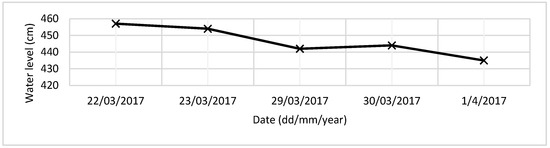The measurements were made in 5 days, within the interval 22.03.2017–01.04.2017. Each bathymetry point is characterized by the longitude and latitude obtained from the RTK GPS, and by the elevation (z), which is obtained by subtracting the water depth from the water surface elevation recorded at gauge station. The variation of the daily water level was obtained from the Sendreni gauge station. As Figure 3 shows, the water level during the measurement campaign varied between 435 and 460 cm.