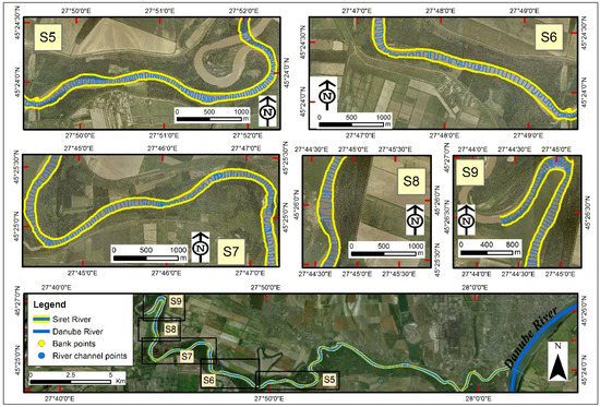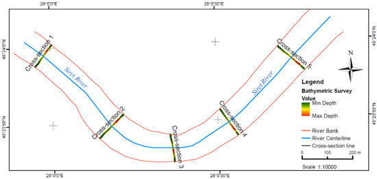 Figure 4 and Figure 5 present the 9 sections of the whole surveyed area. The total length of the surveyed path reached 103.22 km with an average boat speed of 1.75 knots (0.9 m/s). The distance between the cross-section ranges from 25 to 100 m. This distance depends on the linearity or sinuosity of the main river channel being larger in areas where the river track is straight, and smaller where the river is meandered. Since the water discharge rate is high in the case of River Siret (about 1000 m3/s for a 4 m water level) [25], it was almost impossible to maintain equal distances between the cross-sections measured.