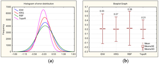 The basic statistical value which defines the dispersion of the frequency distribution of deviations between the measured and unmeasured interpolated values is the mean-standard deviation (mean SD). Figure 7 shows the Gauss curve representation (a) and boxplot chart (b) for each model, which illustrate how closely the created model predicts the measured values. The Gauss distribution shown in Figure 7a proves that the narrowest line is associated to the TopoR method. A good model will be described by a narrow error distribution and a small, close to zero, SD. Both plots in Figure 7a,b suggest that TopoR is the best model, since the associated error histogram is the narrowest and the mean SD is the smallest.