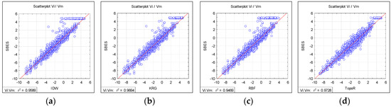 The linear regression for the four interpolation methods: (a) IDW; (b) KRG; (c) RBF; (d) TopoR.