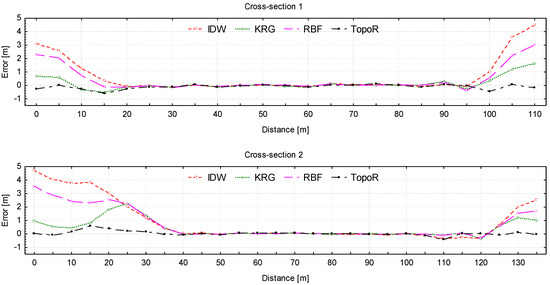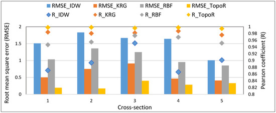 The deviation increases when approaching both banks for all models. TopoR slightly overestimates the elevation for all sections, while IDW and RBF underestimate the elevation at the shores. The KRG model has an irregular behavior, with values which are either larger or smaller than measurements. Obviously the TopoR model is the best, since the deviations from measurements are the smallest (1 m). On the other hand, IDW has the worst performance, with differences between the model and the field measurements of more than 5 m (5.35 m for cross-Section 4, close to right bank of the river flow). It seems that the IDW, KRG and RBF methods are not reliable as long as the river banks have steep slopes.