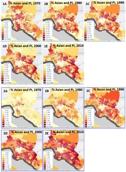 The distribution of the percentage of Asians and Pacific Islanders in 1970, 1980, 1990, 2000, and 2010, in Los Angeles. Maps (1A) to (1E) have different classification intervals, while maps (2A) to (2E) have the same classification intervals.