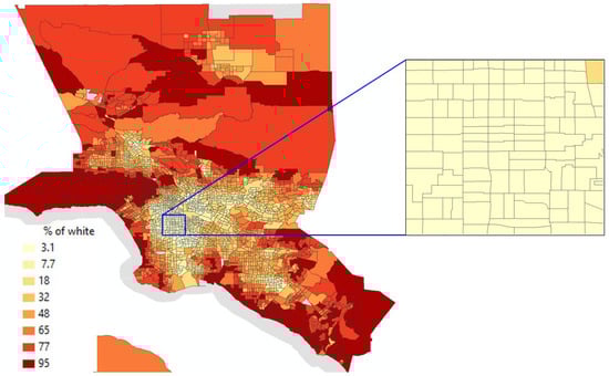 For example, Figure 2 shows what happens when users zoom in on a local region from the whole map. The left map shows the percentage of whites in the Los Angeles metropolitan area at the tract level. The right map shows the zoom-in area of the left map. After users zoom in on a small area such as the map on the right, all polygons have been assigned the same color. To reveal more variation in values in the right map, users would need to manually reselect the polygons, create a new layer with the selected polygons, and reassign the color scheme. The process requires several parameters to be re-tuned.