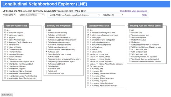 The user interface of the Longitudinal Neighborhood Explorer (LNE) was designed to allow users to explore not only the temporal changes of distributional patterns of each socioeconomic and demographic variable, but also the difference in the distributional patterns of different variables at tract-level in different metropolitan areas or counties in the US. The user interface consists of two parts: the first allows the user to select the variables that they want to visualize, and the second is for visualizations of outputs in response to the user’s selections, to create various views of maps. Figure 3 shows the user interface of the first part. Users have an option to select regions defined in terms of states, metros, or counties. Some of the data are not available in some years, especially in 1970. The unavailable data are represented by strike-out text. As users change the year at the top of the interface, they can check the availability of each variable over time. Users can select as many as variables they want by using the checkbox of each variable. Once the choice is submitted by clicking the button on the left bottom in Figure 3, the second part of the interface (e.g., Figure 4) appears. The second part is where ACM is embedded.