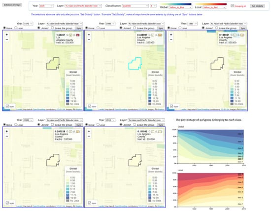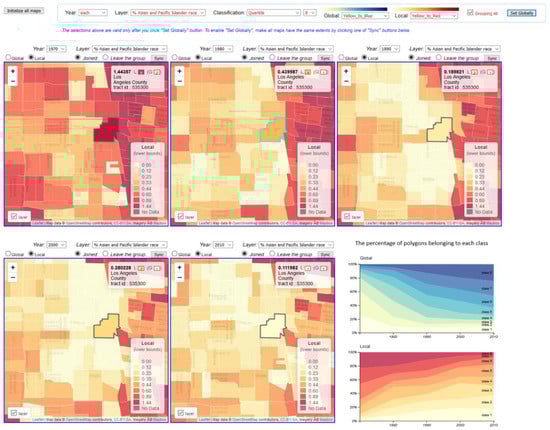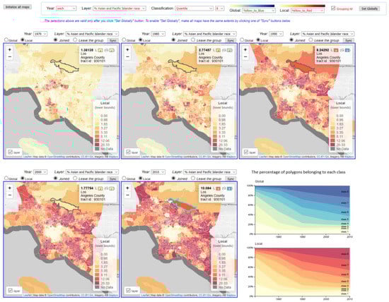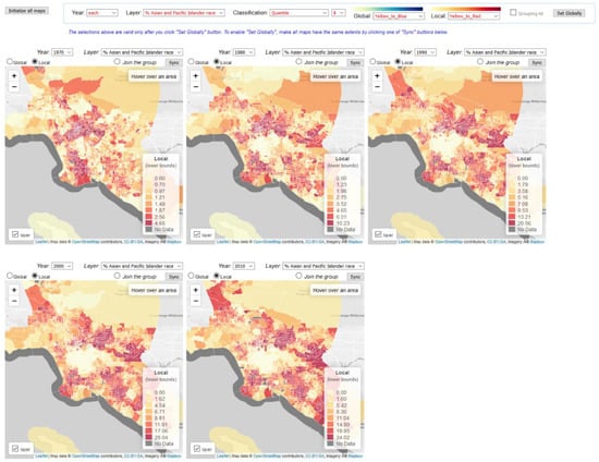 Furthermore, continuous linking allows users to quickly create a series of maps revealing the spatiotemporal change in any zoomed-in regions. For example, both Figure 4 and Figure 8 show the percentage of Asians and Pacific Islanders in 1970, 1980, 1990, 2000, and 2010, from the left map to the right map. Figure 8 is a zoomed-in area of Figure 4. In this case, “Grouping All” was clicked at the initial stage so that all maps were joined in a group (linked) at once. By virtue of continuous linking, the maps in Figure 8 were created from Figure 4, after zooming and panning one of five maps. The video demo at the end of Figure 8’s description shows how Figure 8 can be easily created from Figure 4. In other words, in ACM, the process of creating map views of Figure 8 from Figure 4 can be done with three steps: (1) check the “Grouping All” checkbox, (2) click the “Set Globally” button, and (3) zoom in on a subregion of their interest in any of five maps. In this third step, all maps are automatically adjusted to have the same map extent and class intervals. If each map in Figure 8 was created individually by using conventional GIS software other than ACM, it would have required more steps (see Section 2.1. for details).