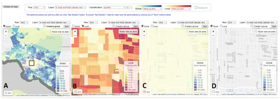 Figure 6, Figure 7 and Figure 8 show how global and local classification work, using the percentage of Asian and Pacific Islanders as an example. In Figure 6, on the top of all maps, each yellow-to-blue and yellow-to-red color scheme was assigned to global and local classification, respectively. At the top of each map, users have an option to select between local and global classifications. When the “Local” radio button is on, the map with local classification intervals is shown (e.g., Figure 6B). When the “Global” radio button is on, the map with global classification intervals is shown (e.g., Figure 6C). Figure 6B,C maps show the same area that is the zoomed-in area of Figure 6A. The Figure 6D map shows the same area as the maps of Figure 6B,C, but shows a base layer, which is OpenStreetMap. By unchecking the “Layer” at the bottom left corner of each map, users can see the base layer of the map.