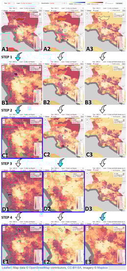 Linking in ACM has two modes: continuous linking and one-time linking. Continuous linking works in the following way: Once any of the maps joins the group, (1) the joined maps are outlined in blue to indicate the maps that will be linked, and (2) the maps in the group are adjusted to have the same map extents and class intervals whenever the user zooms and pans any of the maps. The three maps in Figure 9 show how the continuous linking works. On the interface, the user can only see three maps on each row, at one time. Three map views on each row show the status after each user operation. The blue outlines of the maps indicate the maps that are joined in the group. Arrows indicate the map that changes at each step. For example, Figure 9B1 changes from Figure 9A1 and changes to Figure 9C1. Figure 9 was created to show a step-by-step change. Only one map has a change at each step, and the changing map is represented in a cyan arrow. The Longitudinal Neighborhood Explorer has five maps. Among them, the three maps were captured for the demonstration in Figure 9.