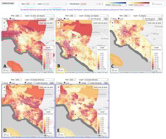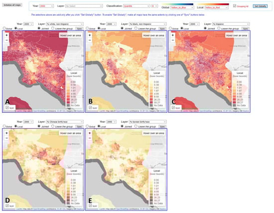 Continuous linking provides several combinations in terms of grouping maps. For example, the maps in Figure 10, from left to right, represent (A) percentage of whites, (B) percentage of blacks, (C) percentage of Hispanics, (D) percentage of Chinese, and (E) percentage of Koreans. In the map views, only (D) and (E) are joined in a group (linked)—i.e., the two maps have the same map extent and the class intervals, so direct comparison between the two maps is possible. On the other hand, all the rest of it (Figure 10A–C) is not joined in a group (not linked), so each of the three maps can be explored individually with its own class interval and map extent. In this case, if the user wants to compare all five maps together, she can join the maps of Figure 10A–C in a group by clicking “Join the group” radio button on the top of each map. Figure 11 shows the views after all maps are joined. On the maps in Figure 11, users can have a uniform comparison of all maps.