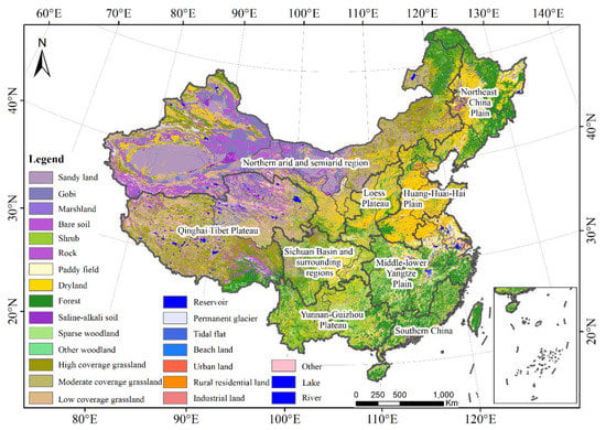 The agricultural spatial pattern in China is characterized by changes in climate and land resources. Figure 1 shows the nine agricultural zones in China with a backdrop of the Chinese land cover map. Considering the geographical differences in light, heat, water, and soil resources that are related to climate and terrain, the agricultural patterns in China were divided into Northeast China Plain (NE Plain), Yunnan–Guizhou Plateau (YG Plain), Northern arid and semiarid region (NAS Region), Southern China (SC), Sichuan Basin and surrounding regions (SBS Region), Middle-lower Yangtze Plain (MLY Plain), Qinghai Tibet Plateau (QT Plateau), Loess Plateau (L Plateau), and Huang-Huai-Hai Plain (HHH Plain) []. The density of population and human activities in these nine regions are different, and a combination of socioeconomic factors and natural geographical backgrounds forms different spatially heterogeneity regions. Given the differences in spatial distribution between socioeconomic factors and agricultural natural zones, this study detected socioeconomic drivers by analyzing the socioeconomic interactions in different regions.
