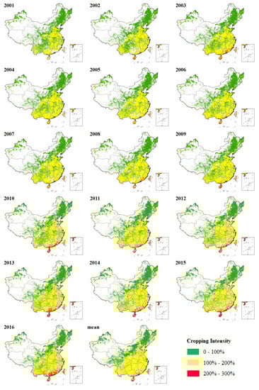 The cropping intensity products from 2001 to 2016 were generated based on our published work (Li et al., 2014) [] with a refinement of sliding windows and land cover maps. First, the EVI time series were derived from the surface reflectance data from both MODIS Terra and Aqua data, which were then further synthesized based on the minimum blue compositing method []. Second, considering the effects of the three fitting methods, including asymmetric Gaussian function, double logistic, and the Savitzky–Golay, the EVI time series data were filtered to obtain a smoothed EVI time series using the SG filter in the software TIMESAT to fill in the missing values and remove noise values and outliers. Then, the peaks and toughs in the smoothed EVI time series were extracted by sliding windows and used to derive the cropping cycles maps at 500-m resolution by counting the peaks and toughs. The cropping cycles included fallow, single cropping, double cropping, and triple cropping, by counting the peaks and toughs. The methodological details for the cropping cycle mapping can be found in Li et al., 2014. Here, the MODIS land surface temperature data were used to eliminate false peaks caused by the sprouting of winter wheat before dormancy in winter. During the night, a land surface temperature for the MODIS products (MOD11A2) with minimum threshold of 5 °C was used to define the real growing season in a year and to deduct the false peak caused by the winter wheat. Moreover, GlobeLand30 was used to refine the cropping intensity maps by defining the class of the cultivated lands. Finally, based on the cropping cycle maps, the cropping intensity was obtained by calculating the ratio of the total sown area of cultivated land to the cultivated land area at a 5 km resolution, while the total sown area was obtained by multiplying the cultivated land area by cropping cycles. When the cropping intensity was between 0 and 1, the cropping cycles were mainly single cropping. When the cropping intensity was between 1 and 2, the cropping cycles are mainly double cropping mixed with single cropping. When the cropping intensity was between 2 and 3, the cropping cycles were triple cropping mixed with double cropping.