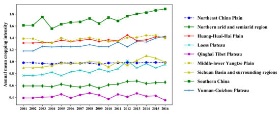 Changes in the mean cropping intensity for nine individual agricultural zones in China in 2001–2016.