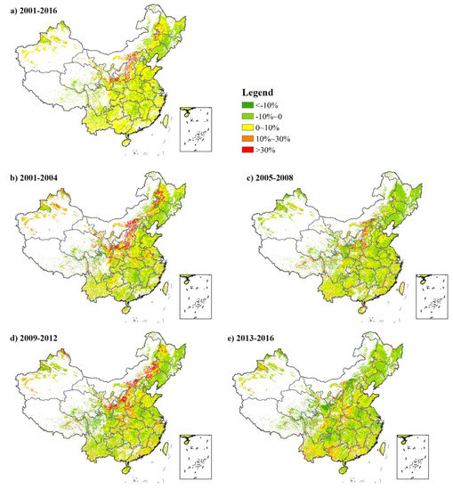 Changes in cropping intensity in China from 2001 to 2016 and at every four year interval. Changes in cropping intensity in China (a) from 2001 to 2016; (b) from 2001 to 2004; (c) from 2005 to 2008; (d) from 2009 to 2012; (e) from 2013 to 2016.