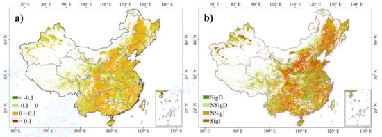 The spatial distribution of cropping intensity trends for each pixel within 5 km grids are shown for (a) changing rates in linear trends from 2001 to 2016 and (b) significances in linear trends from 2001 to 2016 (significantly increasing, SigI; increasing but not significant, Non-SigI; decreasing but not significant, Non-SigD; significantly decreasing, SigD).