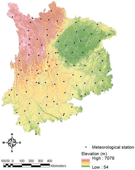 Southwest China comprises three provinces and one municipality: Sichuan, Guizhou, Yunnan and Chongqing, with latitude and longitude ranging from 21–34° N and 97–110° E, which is one of the most densely populated areas in China []. Among them, Sichuan and Chongqing are the top two dense regions, even in their rural areas []. Regarding the temperature, the increase trend is more significant in urban area than that in the rural, especially in Yunnan []. The three provinces and one municipality comprise 47 cities. The area has complex landform and topography, which includes part of the Tibetan Plateau, the Chengdu Plain, the Sichuan Basin and the Yunnan-Guizhou Plateau [], which causes unevenly distributed temperature. The average annual temperature is between 14 and 24 °C in most areas, with the highest record 43.5 °C being found in Chongqing in August 2006 []. Normally, August is the hottest month, and this, together with the adjacent four months (June, July, September and October), comprises the hot season in Southwest China.