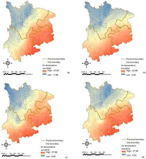 Spatial variation of interpolated air temperature in four months: (a) June 2000; (b) October 2000; (c) June 2015; and (d) October 2015.