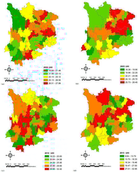 The spatio-temporal variation of urban heat island (UHI) distribution in four different years: (a) 2000; (b) 2005; (c) 2010; and (d) 2015.